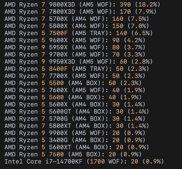甚至要是AMD之前没有停产5800X3D、5700X3D这类处理器,老平台的销量说不定都能和如今的7800X3D、9800X3D一较高下。