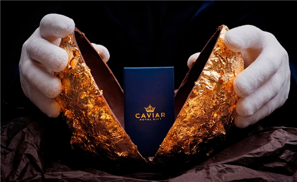 品牌为该系列设计了金色“惊喜蛋”作为产品容器,目标受众精准锁定少数顶级富豪群体。“惊喜蛋”的主体是手工制作的比利时巧克力,里面包裹着完整的特拉比松榛子,外层覆盖着可食用金箔,内部还藏有一把真正的金钥匙。这把钥匙是开启惊喜的关键道具,专门用来解锁与金蛋配套的专属礼盒,礼盒中放置着定制版的苹果iPhone 17 Pro系列手机。