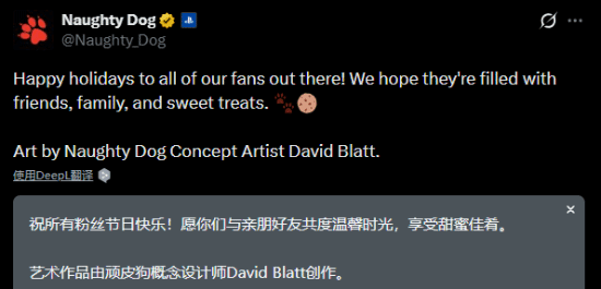 今天是平安夜,明天就是圣诞节了。顽皮狗官方推特于今日发布了一条动态,向广大玩家朋友们送上节日祝福,希望所有粉丝都能和亲朋好友一起度过温馨美好的时光,尽情享用甜蜜的美食。