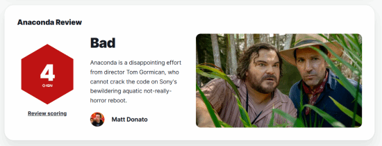 《新狂蟒之灾》定档12月25日登陆北美院线,目前IGN已发布这部影片的媒体评测,评分最终定格在4分。