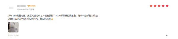 除了颜值与影像这两大核心优势外,vivo S50系列在性能、续航等维度的均衡发挥,同样为其口碑助力良多。性能层面,该系列配备高通骁龙8系旗舰芯片,搭配OriginOS 6系统的流畅调校,不管是运行大型游戏还是进行多任务操作,都能维持稳定流畅的状态;全系列搭载6500mAh蓝海电池,在轻薄机身设计与长久续航能力之间实现了较好的平衡。