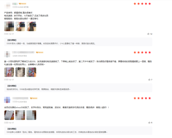 【手机频道】vivo S50系列全渠道开售之后,首批参与先享购的用户口碑评价已正式公布。从用户的好评反馈中可以看到,该系列凭借金属中框带来的质感、3种大师Live运镜的创新设计、6.31英寸小直屏的舒适握持感,以及旗舰级的夜景闪光人像等核心优势,赢得了用户的一致认可。“颜值高”“拍照好用”“手感舒适”成为用户评价中的高频词汇,进一步凸显了这款新机的高性价比和值得购买的特质。
