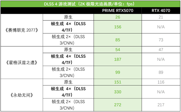DLSS 4是RTX 50系列的核心技术亮点,依托全新Transformer模型,它不仅能带来更出色的画质表现与运行效率,还借助多帧生成技术大幅拔高游戏帧率,使4K画质的3A大作也能达到电竞网游那般数百帧的极致流畅体验!从实测数据可知,PRIME RTX5070开启4×多帧生成模式后,帧率相较原生画面提升了690%,比2×帧生成模式提升84%,与上代RTX 4070开启DLSS 3帧生成的情况相比,更是提升了144%。由此可见,DLSS 4让PRIME RTX5070的性能优势得到了进一步放大。