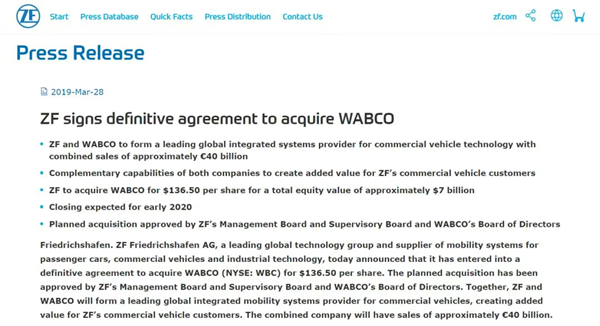 这一局面在很大程度上源于过去的两次大规模并购:2015年,采埃孚斥资129亿美元收购了美国大型汽车零部件供应商天合汽车集团(TRW Automotive);2019年,它又投入超70亿美元收购了美国竞争对手威伯科(Wabco),以此来强化自身在卡车及驾驶员辅助系统领域的市场份额。