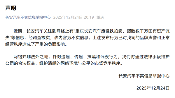 12月24日消息,长安汽车不实信息举报中心今日发布声明表示,近日,长安汽车留意到网络上出现“重庆长安汽车废轻铁拍卖,疑致数千万国有资产流失”等相关内容。