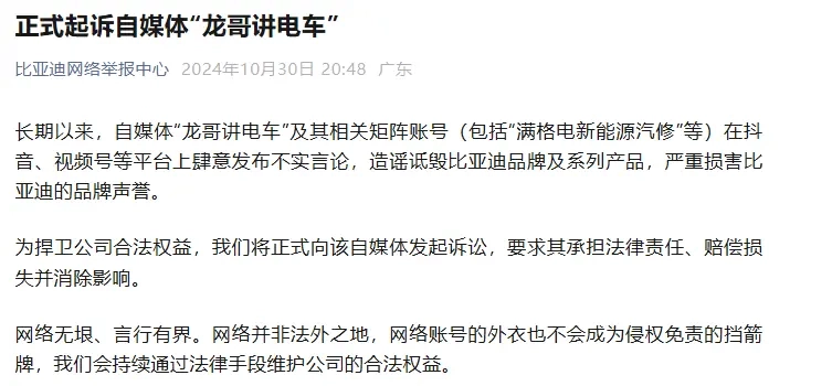 该案的起因是比亚迪网络举报中心在去年10月30日发表声明,称“龙哥讲电车”及其关联账号在多个平台持续发布虚假信息,对该品牌及产品进行抹黑,比亚迪方面就此提起了诉讼。