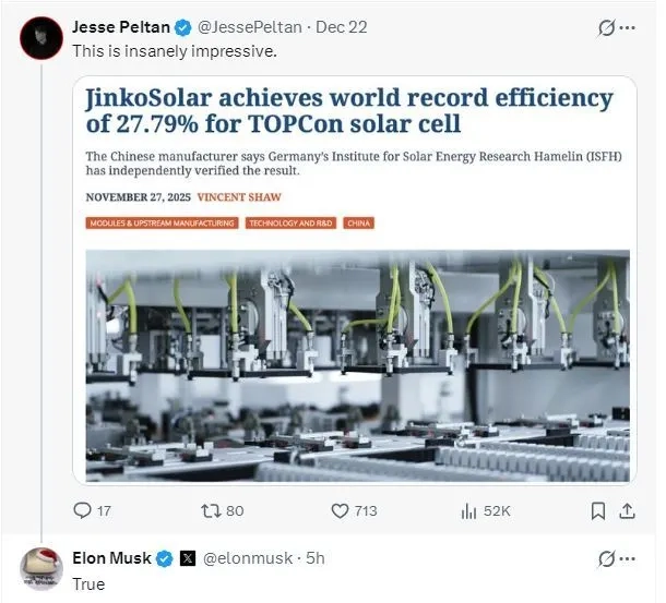 12月25日消息,晶科能源近期对外公布,其依托TOPCon技术平台研发的高效电池,最高光电转换效率达到27.79%,该成果已通过德国哈梅林太阳能研究所(ISFH)的权威认证,成功刷新世界纪录。在社交平台X上,有用户分享了关于晶科能源这一新纪录的报道,并留言感叹:“这实在是让人惊叹不已。”马斯克则回复道:“所言极是。”
