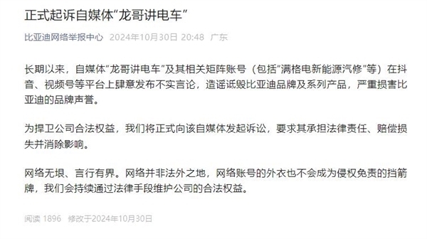 去年10月底,比亚迪网络举报中心对外宣布,已正式对自媒体“龙哥讲电车”提起诉讼。