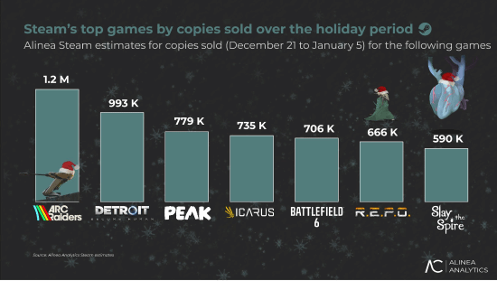 《Arc Raiders》毫无悬念地成为Steam此次刷新历史纪录的核心驱动力。根据Alinea Analytics的数据,这款游戏在该平台的销量已突破120万份,稳稳占据了假日季销量排行榜的首位。