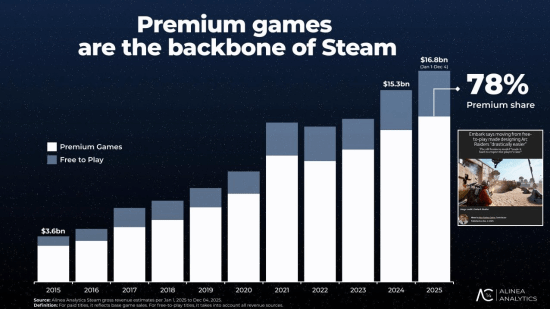 2025年12月创下Steam假日月份营收新纪录,成为平台史上该时段营收最高的月份,单月销售额超过16亿美元(按当前汇率换算,约合111.92亿元人民币),与2024年同期相比大幅增长22.7%,这一增幅相当惊人。