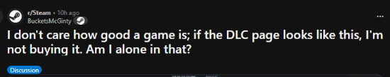 近日,Reddit玩家社区里一则围绕游戏DLC展开的讨论帖激起了热烈反响。有位玩家吐槽说:“我不管游戏本体有多有意思,要是DLC的页面是这种样子,我肯定不会掏钱购买。”