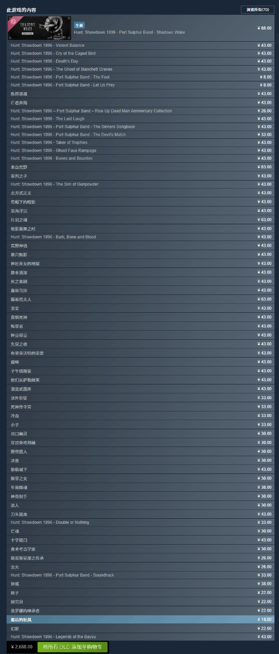 他图中的游戏是《猎杀:对决 1896》,在Steam平台的页面上,这款游戏有将近80个DLC,涵盖了武器、工具、人物外观和音乐等各类内容,这些DLC的总价值差不多达到2700元。