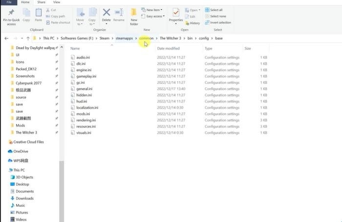 2. 进入游戏根目录后,依次打开The Witcher 3 > bin > config > base文件夹;
