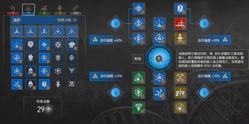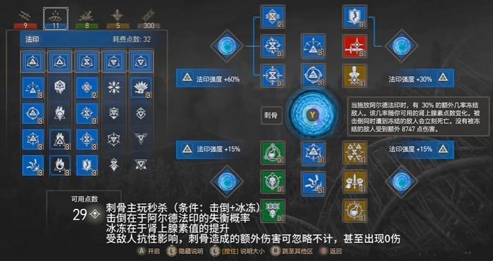 1.刺骨:施展阿尔德法印时,有30%的额外概率冻结敌人,此概率会依据当前可用的肾上腺素点数发生改变。若敌人在被击倒的同时处于冻结状态,将直接死亡;未被冻结的敌人则会承受额外8747点伤害。