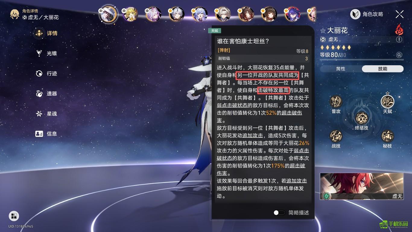 大丽花的效果是让击破特攻最高的角色成为[共舞者]。可以找个等级低的角色,随便穿件加击破特攻的装备,再搭配一个击破特攻低的主C(最好是0),这样开局时等级低的角色就会变成[共舞者],等BOSS把他击败后,大丽花会将另一个角色转为[共舞者],最后打赢这场战斗就能解锁成就。