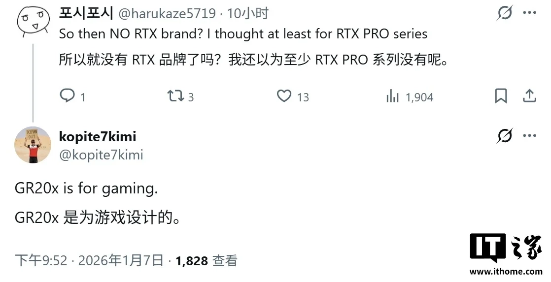 1月8日消息,据消息源@Kopite7kimi昨日(1月7日)在X平台发布的推文显示,英伟达拟于2027年下半年推出GeForce RTX 60系列显卡,该系列将搭载代号为Rubin的全新架构,其核心GPU家族代号已确定为GR20x。