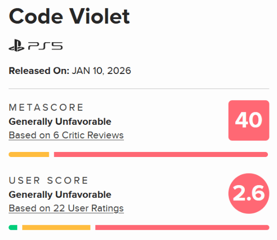 此前游民曾报道,1月10日发售的第三人称动作恐怖游戏《Code Violet》,在M站获得的媒体评分仅为百分制的40分,玩家评分则更低,仅为10分制的2.6分。