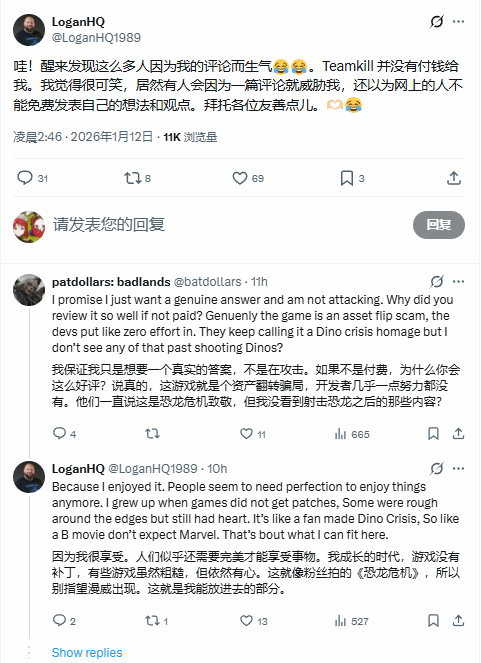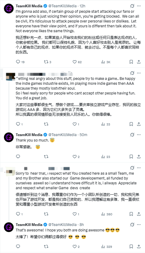 1月12日,游戏官方账号@TeamKillMedia在其个人推特上发文,引用了用户@LoganHQ1989的内容,并针对当下混乱的状况作出回应:“让人深感失望的是,目前有一些人仅仅因为对一款游戏持有不同意见,就去攻击他人。这些人难道不能提出建设性的批评或进行理性讨论,而非要采取攻击行为吗?这说到底只是一款电子游戏而已。”