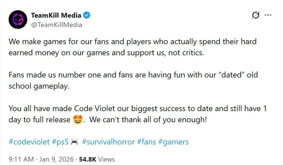 近日,TeamKill Media官方通过推文回应了差评争议,表示《Code Violet》的打造初衷是面向那些真正付费购买该产品的粉丝与玩家,而非针对批评者。此外,开发团队还对游戏的表现进行了庆祝,并透露《Code Violet》是他们目前为止最为成功的作品。
