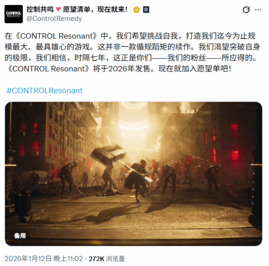 1月12日,官方推特发布消息称:“对于《控制:共鸣》,我们希望突破自我,打造出我们有史以来规模最大、也最具野心的游戏作品。它并非一部墨守成规的续作。我们渴望打破自身的局限,并且相信,在时隔七年之后,这正是你们——我们的粉丝——值得拥有的。”