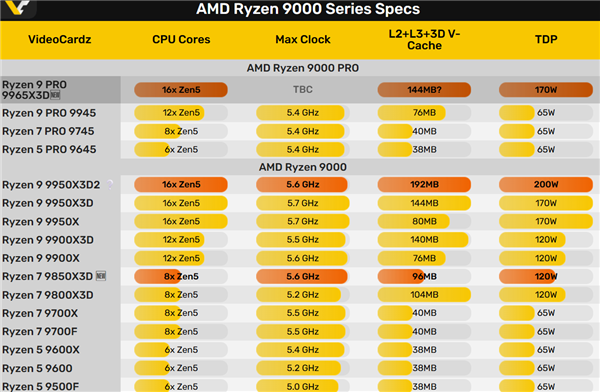 现有的锐龙9 PRO 9945、锐龙7 PRO 9745、锐龙5 PRO 9645三款处理器,核心数依次为16核、8核、6核;缓存规格分别为76MB、40MB、38MB;加速频率均达到5.4GHz,热设计功耗则统一为65W。