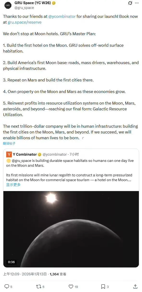 GRU Space 的全称是 Galactic Resource Utilization(银河资源利用),它的长期愿景并非局限于建设月球酒店,而是计划在月球、火星以及小行星上进行资源开发,从而为人类在太空的长期生存与拓展筑牢根基。