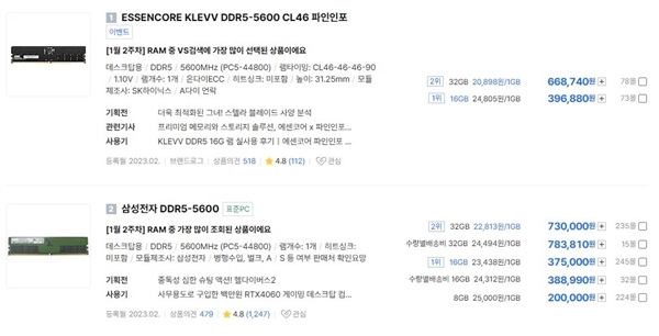 根据韩国电商平台的最新报价,单条16GB DDR5-5600(CL46)规格的内存售价已接近400,000韩元,换算成人民币大约是1900元;而常见的32GB内存,报价区间则在680,000到780,000韩元之间。