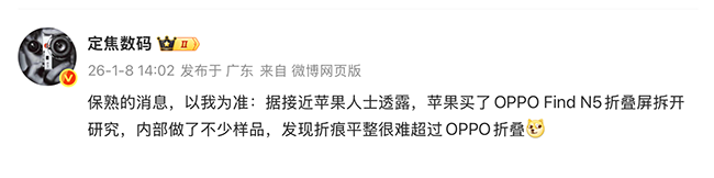 折叠屏市场的竞争已从早期聚焦“形态创新”转向“体验优化”的关键阶段,折痕控制、铰链寿命与手感打磨成为新的比拼焦点。苹果此次对OPPO Find N5进行拆解分析的举动,从侧面印证了国产折叠屏技术在全球领域已占据领先位置。