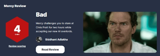 科幻悬疑新片《极限审判》(Mercy)的媒体评价已于近日公布。其中,IGN给出了仅4分的评分,并在短评中表示:“这部电影仿佛在向你发起一场挑战——让你盯着演员看足两小时,与此同时接受我们全新的AI统治者。”