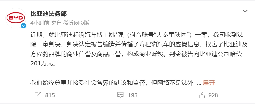 比亚迪收到法院一审判决,认定被告编造并传播方程豹汽车虚假信息,损害了比亚迪及方程豹品牌的商业信誉与商品声誉,构成商业诋毁,判决被告向比亚迪公司赔偿201万元。