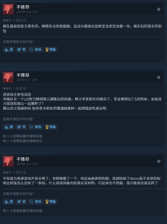 尽管这款游戏被称作“重制(极)”,但玩家发现冲绳的城市场景几乎没有变化,其光影效果和贴图精细度甚至比不上2020年推出的《如龙3 高清复刻版》,画质方面反而不如复刻版本。