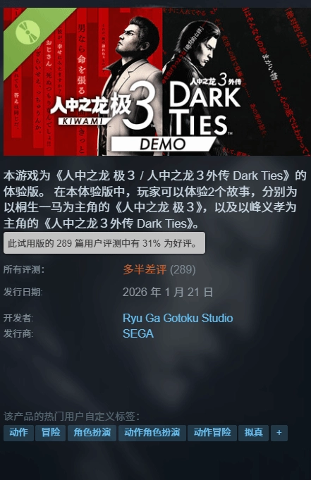 昨天,备受瞩目的《如龙 极3 & DarkTies》(Yakuza Kiwami 3 & Dark Ties)试玩版已正式在Steam平台上线。