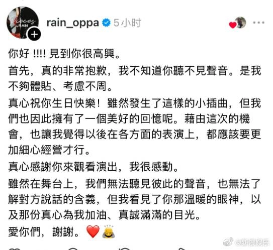随后Rain用中文回复并向她致歉:“是我不够细心,思虑不全”,“尽管我们没办法听到彼此的声音,也没办法知晓对方话语的意思,可我看到了你那温暖的眼神。”