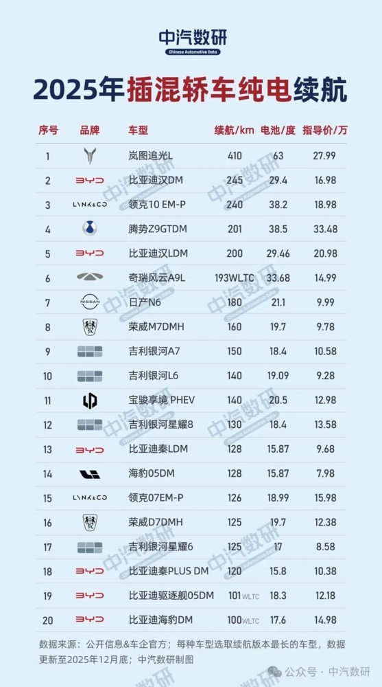 1月22日,中汽数据研究中心发布了2025年度插电混动与增程式混合动力车型的纯电续航能力排行榜。根据榜单内容,极氪9X依靠其搭载的70度大容量电池以及380公里的纯电续航表现,在插混SUV类别中位居榜首;而在增程SUV领域,智己LS6则以450公里的纯电续航成绩拿下该赛道的第一名。