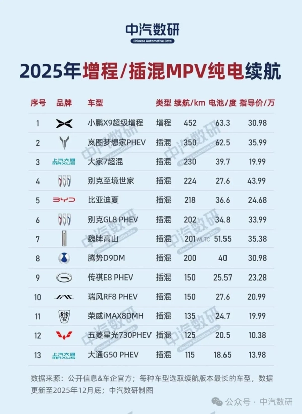 在MPV细分市场,小鹏X9超级增程凭借63.3度电池及452km续航表现位居领先位置,岚图梦想家PHEV(350km)紧随其后,这一格局展现出MPV车型在新能源化进程中的显著突破。大家7超混则以230km的续航成绩跻身前列阵营。