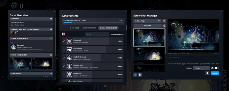 我们新增了从Steam界面固定窗口的功能,让这些窗口能够在游戏过程中悬浮显示在游戏画面之上。这些被固定的窗口支持调整不透明度,并且只有窗口内的核心内容会被固定——标题栏及其他非必要的界面元素不会包含在内。借助这一功能,玩家可以随时访问笔记、游戏指南、社区讨论、成就页面以及内置网页浏览器。无论是在游戏时记录进度、查看攻略,还是像拥有“分身术”一样同时兼顾观影,这个功能都能带来极大便利。