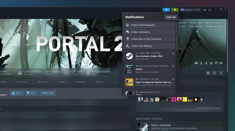 Steam的通知功能进行了更新与优化,实用性得到提升。绿色铃铛图标只有在收到真正的新消息时才会亮起。托盘区域仅展示新通知,同时新增了“查看全部”页面,可查看历史通知记录。我们还增加了新的通知详情设置选项,方便您自主控制通知的类型及接收渠道。