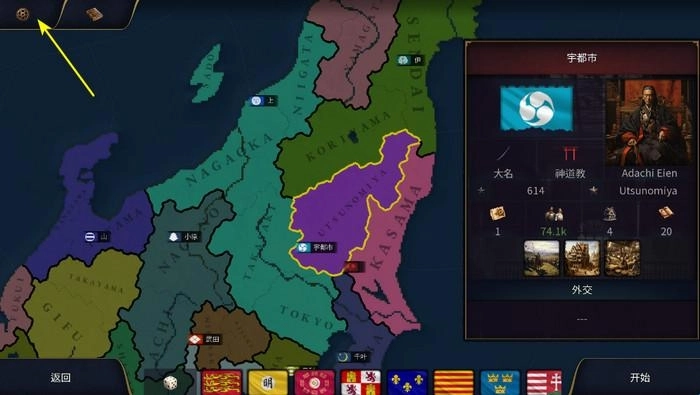 3、在文明选择的大地图界面,点击左上角的【褐色齿轮】图标;