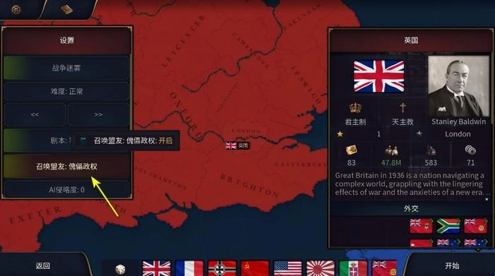 3、在菜单中开启“召唤盟友:傀儡政府”;