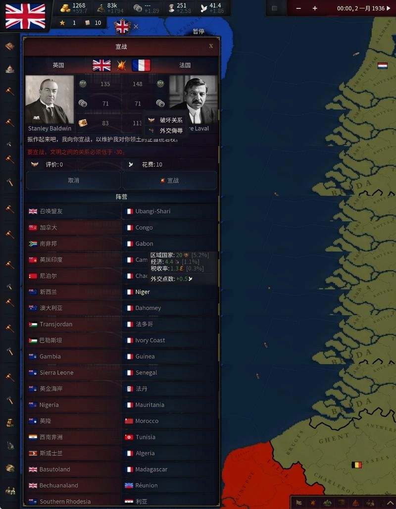 6、在地图界面中,找到你打算宣战的国家并点击,随后选择“宣战”选项。