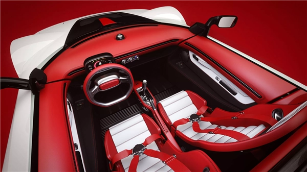 车内的设计风格简约复古,整体运用红白撞色搭配,配备双辐式方向盘与悬浮式液晶仪表,中控台仅保留实体旋钮,未设置过多屏幕,桶形座椅还配有赛车专用的四点式安全带。