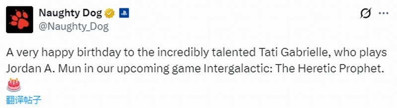 近日顽皮狗工作室发布推文,为《星际:异端先知》女主角乔丹的饰演者塔蒂·加布里埃尔(Tati Gabrielle)庆祝30岁生日,同时附上了她在游戏中的表演片段。
