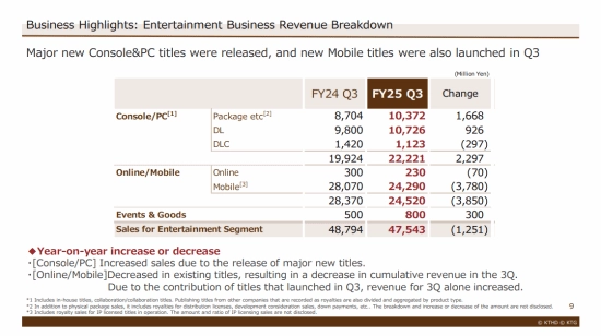 在业务亮点方面,主机/PC板块已成为关键的增长驱动力。第三季度该板块销售额同比增长22.97亿日元,达到222.21亿日元,这主要得益于多款重量级新游戏以及中等体量作品的推出,像《真三国无双:起源》等作品的市场表现十分突出。值得注意的是,该板块的盒装游戏、数字下载业务均实现了同比增长,只有DLC业务收入出现了2.97亿日元的小幅下滑。