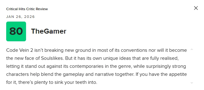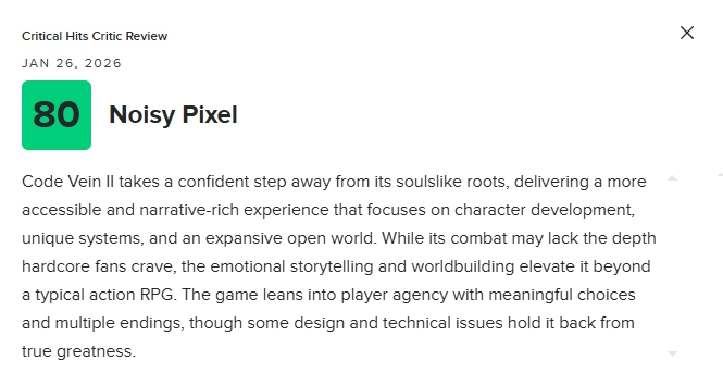 《噬血代码2》在初代的基础上,对核心玩法进行了有效的拓展与优化,打造出节奏更紧凑、挑战性更高且具备高度自定义空间的战斗系统,同时呈现了一段颇具吸引力的故事线。时间穿越机制的引入,以及向开放世界架构的转型,让探索环节拥有了更丰富的变数,不过后者的表现并未显著超越同级别作品的一般水平。综合来看,虽然本作借鉴了不少口碑出色的游戏作品的设计思路,但依旧明确了自身独特的动作RPG风格与独立的作品特质。