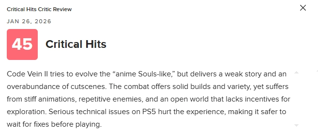《噬血代码2》想要在“二次元类魂”的定位上有所突破,可惜剧情表现不尽如人意,过多的过场动画还拖累了游戏节奏。战斗系统在装备搭配和玩法丰富度方面依旧有可圈可点之处,但受制于动作表现生硬、敌人设计重复率较高,以及开放世界缺乏足够的探索吸引力。PS5版本存在比较突出的技术问题,对整体游戏体验造成了明显影响,更稳妥的做法或许是等后续修复完善后再考虑购买。