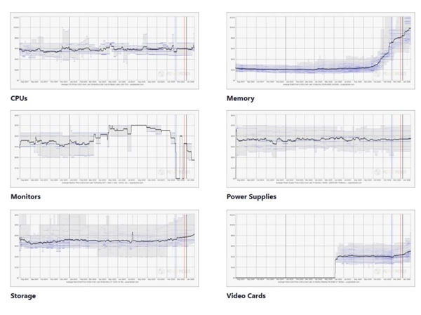 数据表明,过去一年半里,处理器与电源供应器的价格走势较为平稳,显示器价格还稍有下降,不过内存和存储设备的价格却发生了明显变动。