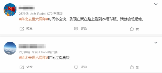 网友们纷纷感慨:“时间过得真快啊,直到现在,我在路上只要看到24号球服,就会不由自主地想起他。”