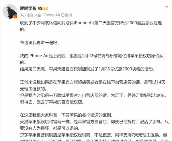 这大概是国内最不走运的苹果粉丝了,刚入手的iPhone Air才第二天就碰上官方降价2000元,而且还没法退还差价。