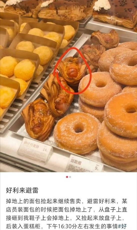 近日,浙江台州市民反映,在当地一家好利来门店见到店员把掉落在地上的面包捡起来继续售卖。据了解,当时店员在装盘过程中不小心将整盘面包弄掉了,其中一部分面包接触到了地面和顾客的鞋面。但该店员并没有按照“落地即弃”的规定进行处理,而是直接将这些面包放回了开放式展柜准备出售。