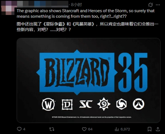不过有一点值得留意,部分粉丝猜测实际内容或许不局限于此,原因是暴雪之前公布的一张庆祝公司35周年的视觉海报里,还出现了《星际争霸》与《风暴英雄》的相关标识。当然,这张图片也有可能是为了宣传暴雪35周年的其他纪念活动。在此建议大家保持理性的态度看待此事。